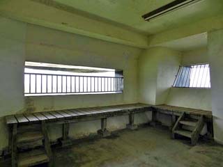 「ヤンバルクイナ展望台」の中。 展望台の中には、2つの窓があり、何れもガラスは、 ないのだが、転落防止の鉄格子が設けられている。 |