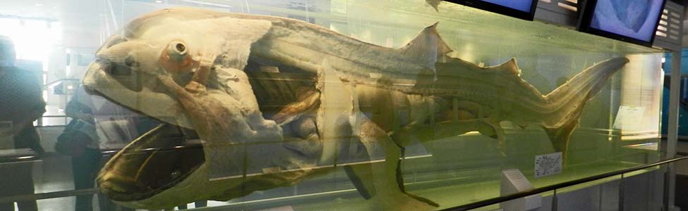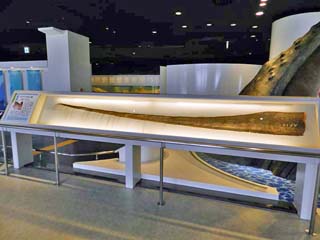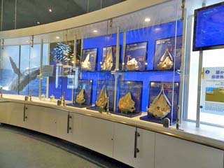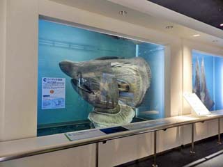 「ザトウクジラの実物大レプリカ」。 「ザトウクジラ」が補食する様子を再現したという。 この「ザトウクジラ」の口の中に入って記念撮影を