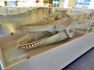 「マッコウクジラの全身骨格標本」。 体長10mの雌で、取得地、沖縄県うるま市とある。 写真をクリックすると拡大写真(600x450)が 表示されます。 |