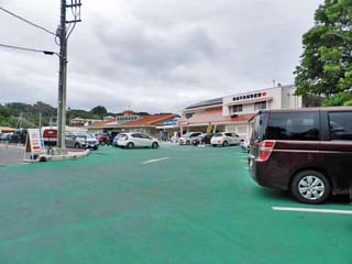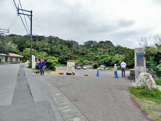 「緑の館」近くの駐車場。 入口の看板には、「駐車場は移転しました。 移転先は、地域物産館、知念岬公園駐車場」とあり、 観光客の増加に伴う周辺生活道路の渋滞から、 住民生活道路の確保や緊急車両への対応、
