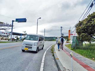 「斎場御嶽」を示す標識。 「南城市地域物産館」前の交差点を渡ると、すぐ西側に 郵便局(写真に写る赤い看板)が見える。