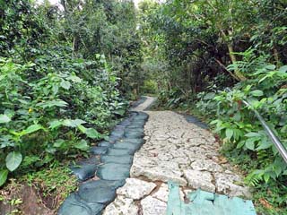 「御嶽」内の参道。 参道脇の「土嚢」は、観光客の増加により、石畳が すり減る等の損傷が増えているという。 |