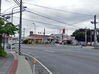 「郵便局」の近くから見る「地域物産館」。 建物は、左の赤い屋根が「がんじゅう駅・南城」、 その右に「南城市地域物産館」。