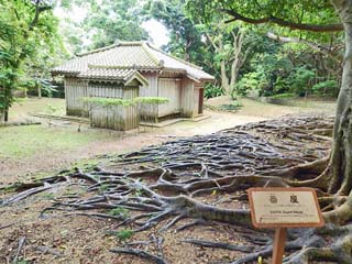 2015/4/10(14:01) 「番屋」。 「識名園」を日常管理する人達の詰め所であったという。 地面にびっしりと張るのは「ガジュマル」の根である。 なお、この写真では建物を裏から撮影しているが、 順路では、帰路にも立ち寄り、帰路では建物を表から 見ることができる。 写真をクリックすると1.75倍ズームで撮る「番屋」が 表示(600x450)されます。 |