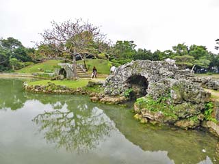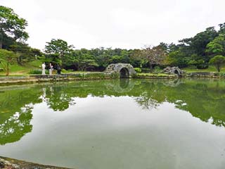 2015/4/10(14:33) 「六角堂」。 池に浮かぶ島に造られた六角形の東屋で、屋根の形や 瓦の色が中国的な趣を感じさせるとあるが、 明治時代までは、六角ではなく四角形の入母屋造りで あったという。 島に渡る石橋は、琉球石灰岩の一つ石である。 写真をクリックすると拡大写真(600x450)が 表示されます。 |
