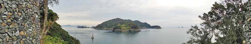 釣のメッカとしても知られるが、樹齢400年を超える アコウの大樹は、県の天然記念物に指定されている。 「大島」の右端に見える海蝕洞は「壇の窓」と呼ばれる。 写真をクリックすると「壇の窓」が 拡大表示(600x450)されます。 |