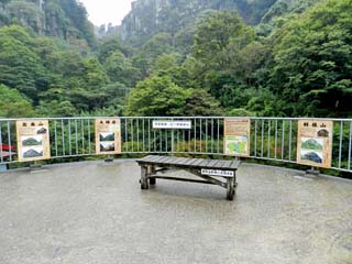 「深耶馬渓」を代表する岩峰群が一望できる。 左の写真、展望台の奥は、「鳶の巣山」。右の写真奥には、小さく「夫婦岩」が写る。