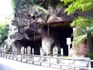 2010/7/4(13:50) 「法身窟」。 鎌倉時代の半ば、ここで法身禅師が修行し、諸国 行脚中の「北条時頼」と出会った場所と伝えられ ている。左右の石碑には「観音像」が刻まれ、 左は寛政12年(1800)建立の「鎮海観音」 、右が文政6年(1823)建立の「楊柳観音」 である。洞窟の中には、「北条時頼の供養碑」、 「三陸大海嘯犠牲者の供養碑」等、「玉石混淆」 で、いろいろな人が祀られている。 |
