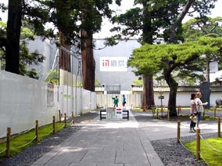 2010/7/4(13:02) 「境内入口」を入ると、修理中の本堂が工事用の 柵とネットで囲まれていた。 「瑞巌寺本堂」は、書院造り入母屋造本瓦葺で、 延べ数百人が、4年の歳月をかけ、慶長14年 (1609)に完成したという。正面39.0m、 奥行き25.2mで、国宝に指定されている。 |