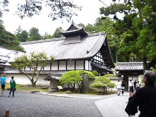2010/7/4(13:06) 「庫裡(国宝)」を正面から見る。 特別公開で、中に入ることはできたが、 中は、撮影禁止のため、写真を紹介することが できない。 また、「大書院」も特別公開されており、本来は 本堂に安置されている「御本尊」等は、平成の 大修理期間中「大書院」の中で公開されている。 |