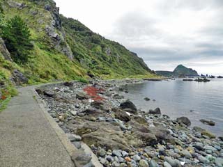 2016/9/27(7:31) 舗装が終り、この先道がはっきりしなくなるが、 海岸沿いを歩いていれば、道を外すようなことはない。 |