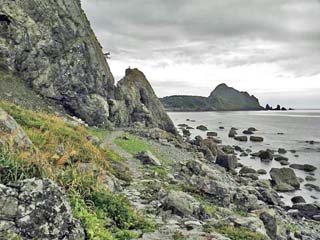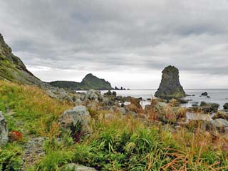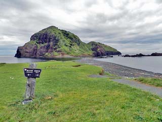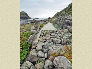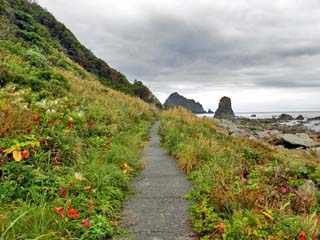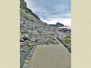 2016/9/27(7:16,7:18) 「二ツ亀」と「二ツ亀自然歩道」。 「賽の河原」は、佐渡島の最北端にある景勝地「大野亀」と「二ツ亀」を結ぶ、「二ツ亀自然歩道」にある 「海食洞穴」である。 「賽の河原」は、現世と冥土の間にある「三途川(さんずのかわ)」にあり、親に先立つ不幸な子供達が、 石を積んで塔を作る「石積みの刑」を受ける場所といわれる信仰の地(霊場)で、洞窟の中や その周辺には、子供達の霊を供養するため、無数の石地蔵や石積みが並ぶ。 右の写真に写る標識には、「賽の河原まで、1.3km」、その先「願集落まで0.8km」とある。 つまり、反対(西)側にある「願(ねがい)集落」から歩けば、その距離は0.8kmですむのだが、 この日は「二ツ亀」に寄った足で、そのまま「賽の河原」へと向かった。 なお、駐車場から「二ツ亀」までの間については、「二ツ亀のページ」で紹介しています。 左の写真をクリックすると「二ツ亀」周辺の案内図(800x600)が表示されます。 |