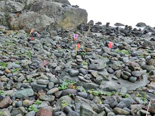 2016/9/27(7:37) 「賽の河原」に到着。 人の手が入ったように見えたのは、「かざぐるま」と 石積みであった。 「石積みの刑」を受けた子供達は、懸命に石の塔を 作るのだが、夕方になると「地獄の鬼」に崩されて しまう。「地蔵菩薩」に救われ、鬼が去ると、子供達は、 また一から石を積み上げ、翌朝には完成させるという。 この「賽の河原」の言い伝えは、仏教の教えではなく、 「民間信仰」が発達したものだという。 写真をクリックすると「賽の河原」の案内版(800x600)が 表示されます。 |
