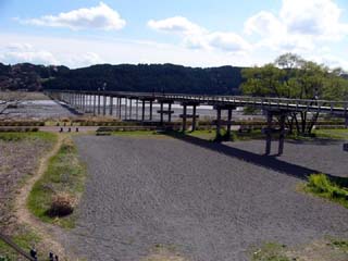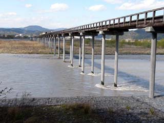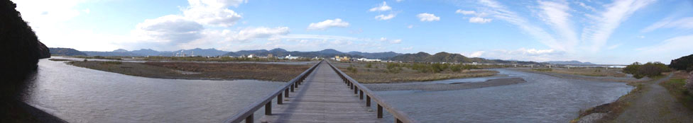 | 2010/3/26(13:26) 大井川左岸から見る「蓬莱橋」。 明治12年に架けられた橋で、全長897.4m 平成9年「世界一の長さを誇る木造歩道橋」と して認定され、ギネスブックにも載る。 |