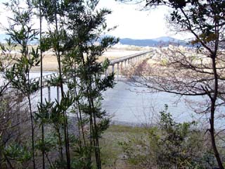 | 2010/3/26(13:45) 「蓬莱橋」を大井川右岸に渡ると「谷口原周遊 コース(一周90分)」と書かれた案内板あり、 これに誘われ途中まで散策することにした。 写真は、「七福神の小径」に入ったところで、 振り返って見る「蓬莱橋」。この角度から見る と、橋の長さがよく分かる。 |