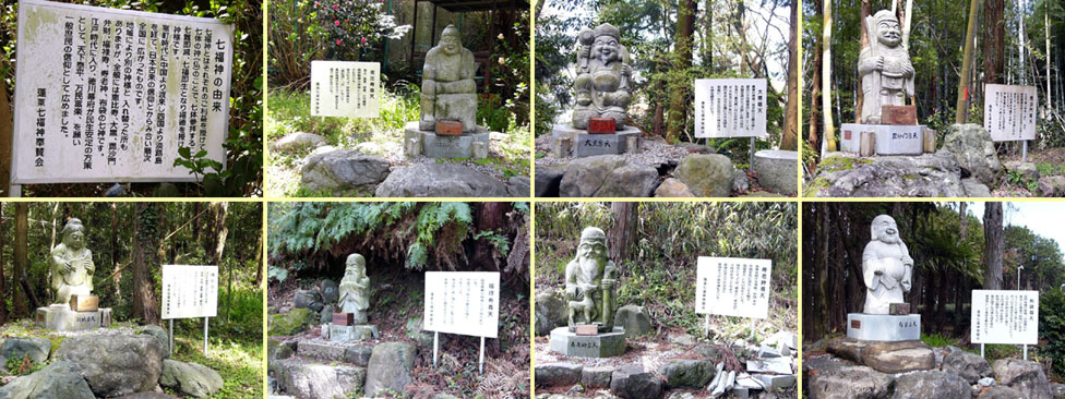| 2010/3/26(13:41~13:58) 「七福神の小径」にある各神様。なお、七体揃って並んでいるわけではなく、各々が離れているため、その距離は撮影時刻を参考にして頂きたい。 上段左から「七福神の由来(13:42)」。七福神とは「七体参拝することで、七難即滅、七福即生となり福徳を授ける神様」とある。 「恵比寿尊天(13:41)」。海上、漁業、商業の守護神。商売繁盛の神様。 「大黒尊天(13:50)」。農業の神様。 「毘沙門尊天(13:51)」。仏法守護の神様。財宝福徳を授け、子宝を授ける神ともいわれる。 下段左から「辧財尊天(13:53)」。インド神話の河川を守る神。 「福緑寿尊天(13:54)」。延命長寿の神様。 「寿老神尊天(13:57)」。長寿を授ける神様。 「布袋尊天(13:58)」。笑門来福の神様。 |